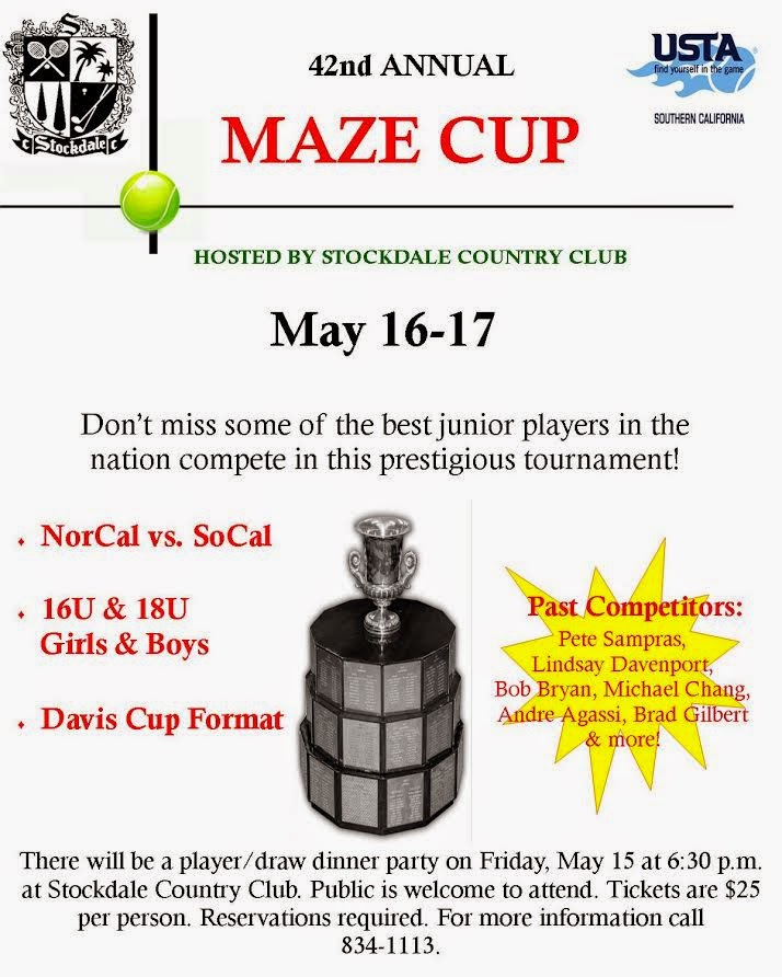 * … MAZE CUP: The Maze Cup, a tennis tournament featuring some of the top juniors from Northern and Southern California, is coming back to Stockdale Country Club this year. It is set for May 16-17 and trust me, this is one tournament you don't want to miss. Some of the past participants include Lindsay Davenport, Pete Sampras, Andre Agassi, Michael Chang and Bob Bryan. The cost to attend is $25 and reservations are required. Call (661) 834-1113.