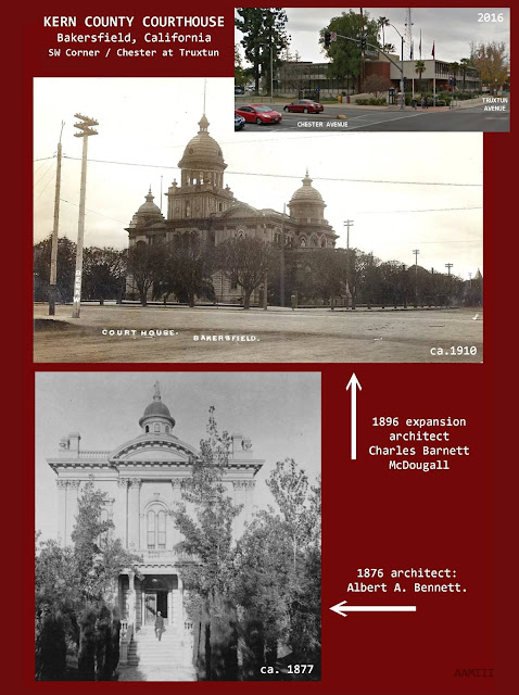 * ... MEMORIES: How about this photo I spotted on the Kern County of Old Facebook page. Its caption: "Comparison photos / SW Corner Chester at Truxtun. When the Kern County seat was moved from Havilah to Bakersfield a new courthouse was constructed in 1876. It soon became inadequate for the growing county. In 1896 it was reconstructed with additions that doubled the size of the original building (Post card photo below). When a more modern courthouse was built across the street in 1912, the county sold the old courthouse to the City of Bakersfield for use as its city hall. Both the old and new courthouses were damaged in a 1952 earthquake and demolished. The 1876 architect was Albert A. Bennett. The 1896 expansion was designed by architect Charles Barnett McDougall. A cement-and-wrought iron fence that enclosed the 1896 courthouse now stands inside the entrance of the Kern County Museum."